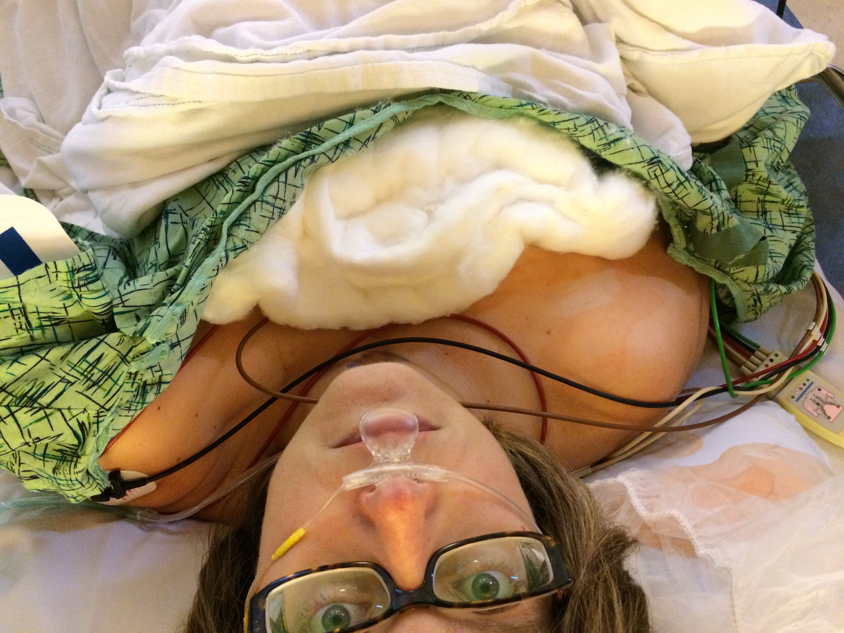 I woke up in the recovery room, slightly annoyed to have a nice dream interrupted. I dozed on and off for about an hour and then really started waking up. I took some selfies and texted lots of people. I was having relatively little pain, except for my throat, from the tube they’d put down it.
