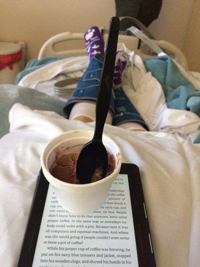 After a while I started perusing the room-service-I-mean-cafeteria menu. The nurse explained that I’m on a liquid diet until I pass gas! LOL! So I had chocolate ice cream for dinner instead, yum! Channeling my children, I suppose… Speaking of the kids, I then called them at Mackie’s. They are doing fine and were happy to hear from me. The hotel-staff-I-mean-nurses are making me plenty comfy. They took a few monitors off, but I’ll need the oxygen all night. I’m trying to get some throat lozenges since my throat is still sore, really my only issue. I have not tried the pain pump yet; nothing really hurts that much yet (boob-wise) so I figure I’ll test that out when I’m ready to go to sleep.